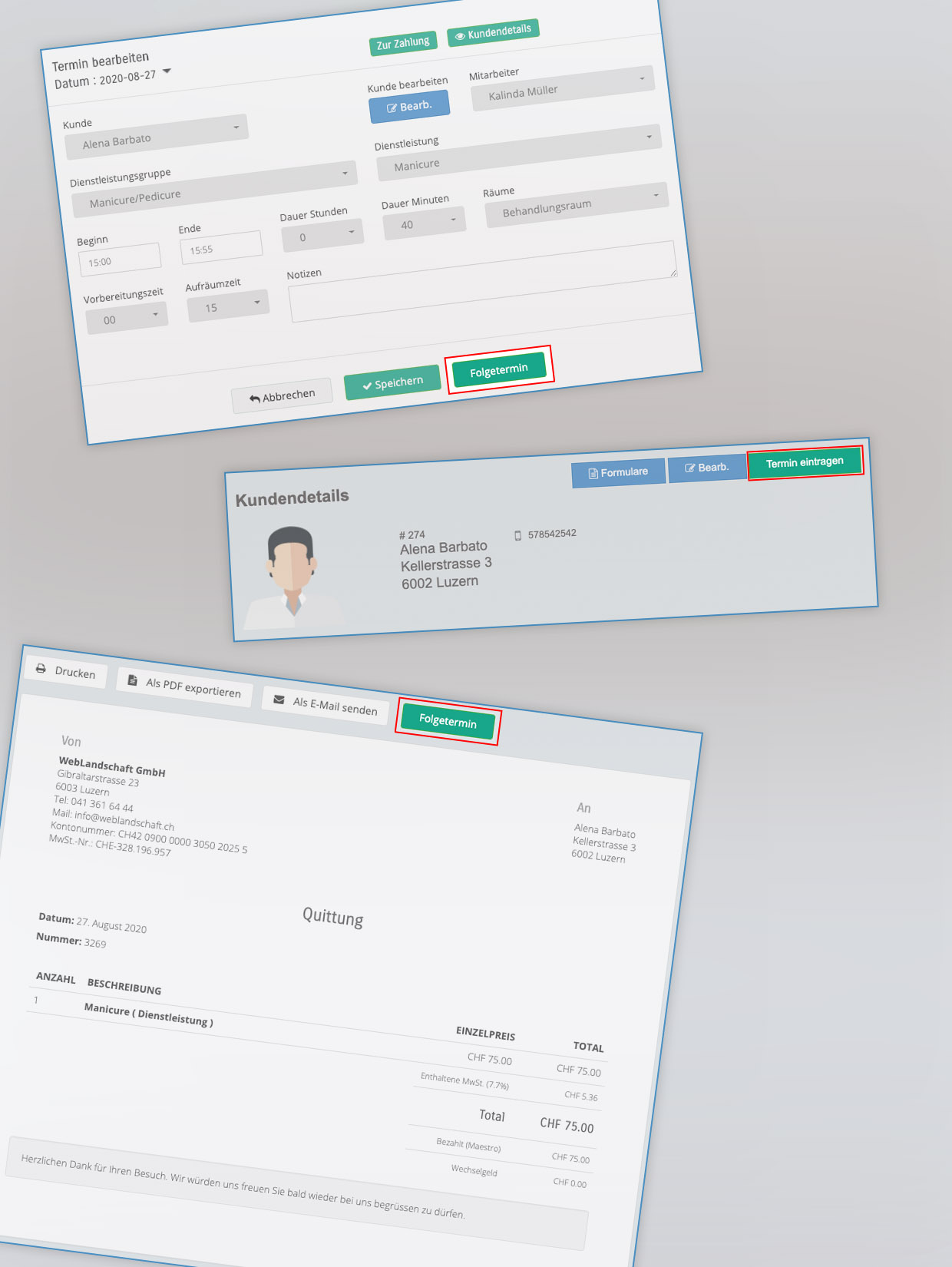 Sehr oft ist es der Fall dass Kunden nach dem Abschluss eines Termins bereits die nächsten Termine buchen möchten. Um dies zu beschleunigen wurde eine Folgetermin-Funktion in die Software integriert. Damit lässt sich an einigen Stellen der Software schnell ein neuer Termin für diesen Kunden in den Kalender eintragen.