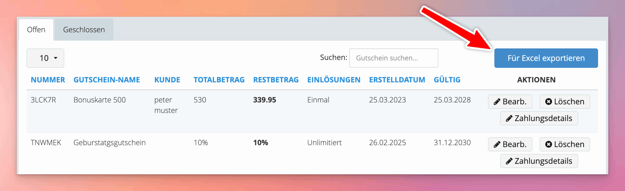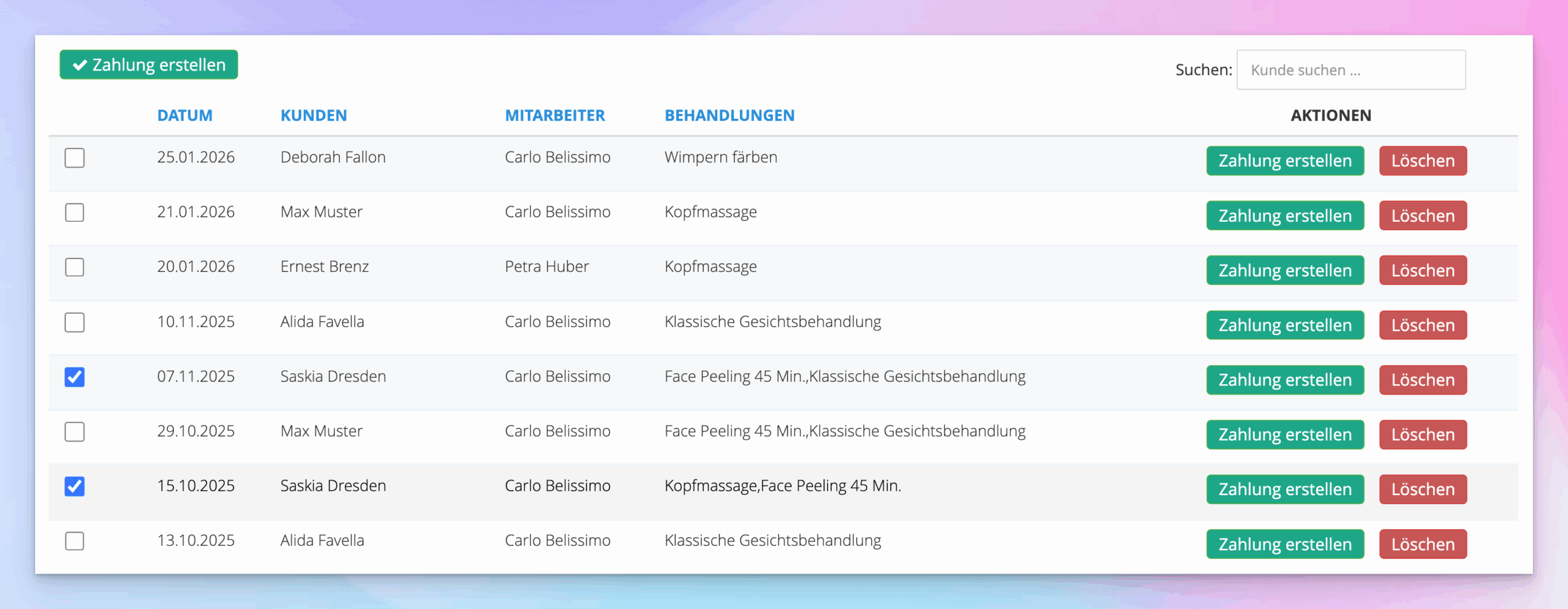 Auf der «Neue Zahlungen» Seite befindet sich eine neue Checkbox mit der mehrere Termine desselben Kunden aus unterschiedlichen Daten kombiniert angewählt werden können. Wird dies gemacht erscheint ein neuer Button mit dem alle gewählten Termine in einer Zahlung kombiniert abgerechnet werden können. Es funktioniert nur wenn alle gewählten Einträge vom selben Kunden sind.