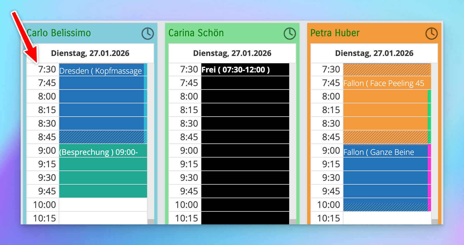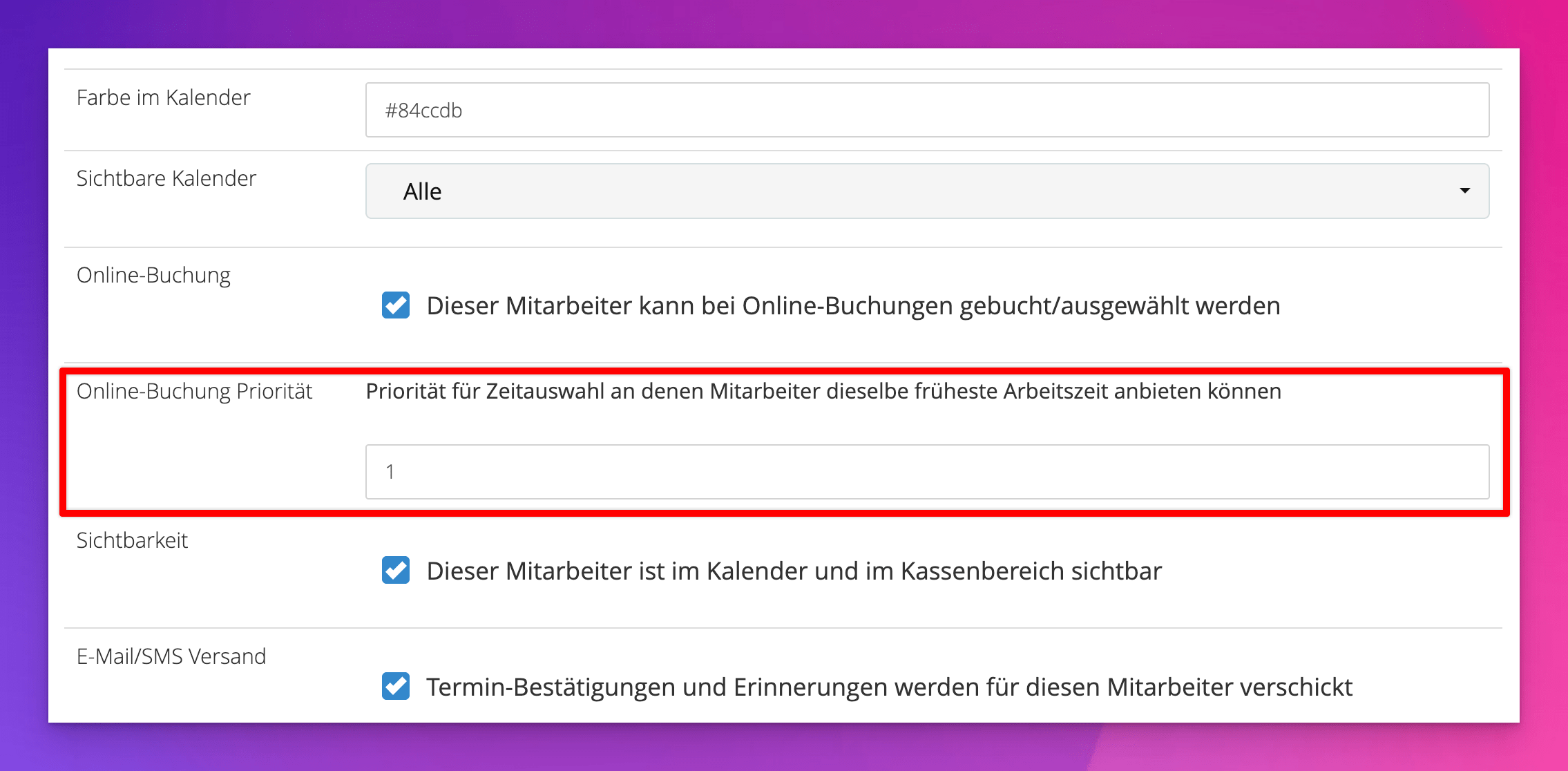 Sollte ein Geschäft mehrere Mitarbeiter haben welche am selben Datum arbeiten, steht dem Kunden im Online-Booking die Auswahl «Erster freier Mitarbeiter» zur Verfügung. Dies bucht den Termin beim Mitarbeiter welcher Zeitmässig den frühesten Termin anbieten kann. Sollten mehrere Mitarbeiter dieselbe Startzeit haben lässt sich beim bearbeiten des Mitarbeiters durch Eingabe einer Nummer eine Priorität festlegen. Mitarbeiter mit der Nummer 1 werden damit immer zuerst ausgewählt.