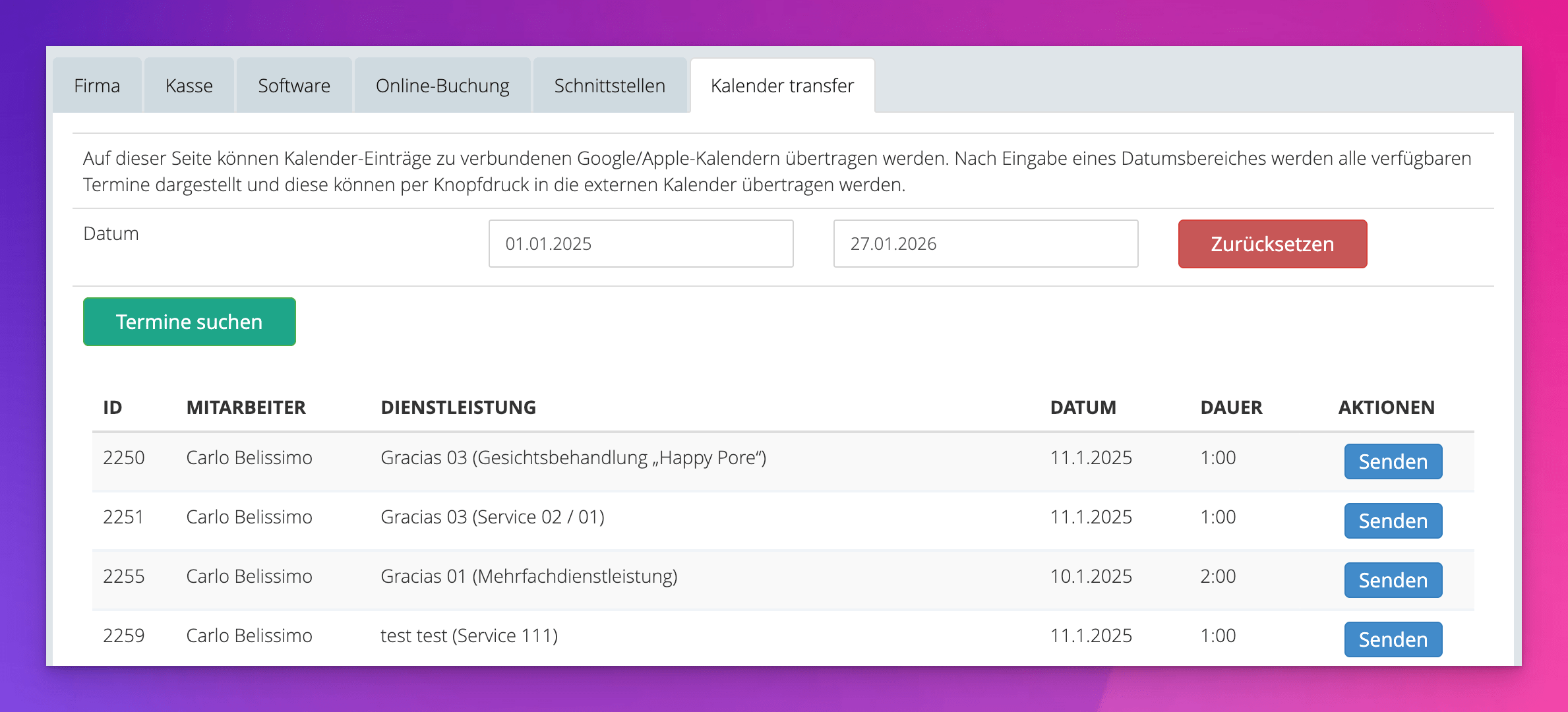 Wird ein externer Kalender mit Coboma verbunden gibt es eine neue Seite in der manuell einzelne Termin-/Platzhalter-Termine zu Google oder Apple-Kalendern gesendet werden können. Es können nur Einträge übertragen werden welche noch nicht synchronisiert wurden.